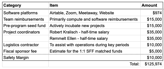 • Tier 1 ($0-$126k): Basic operational costs for AISC12, covering organizer salaries and project support, including up to $1k per project in tools and compute.