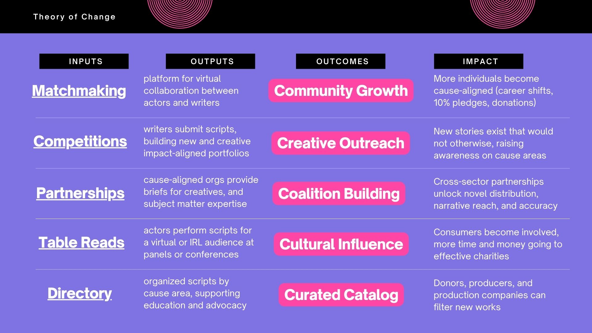The goal is to build the narrative infrastructure for impact. Creating a scalable on-ramp for writers and actors to engage with impact issues through cause-area storytelling competitions and creative collaborations.