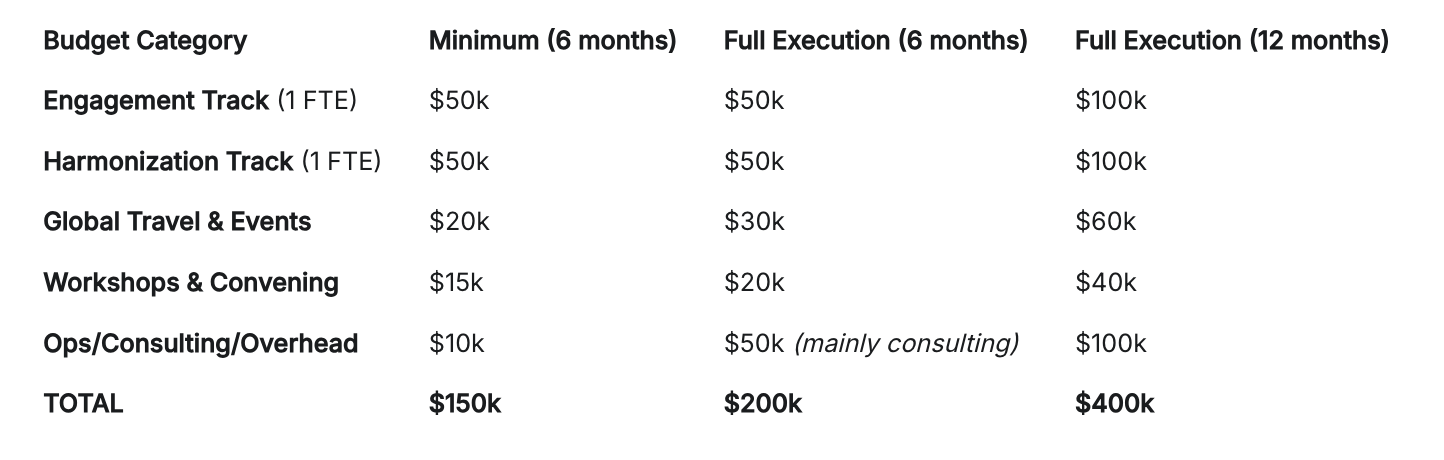 We are requesting $150k for the immediate Q1-Q2 2026 diplomatic sprint. Full 12-month execution requires ~$400k.