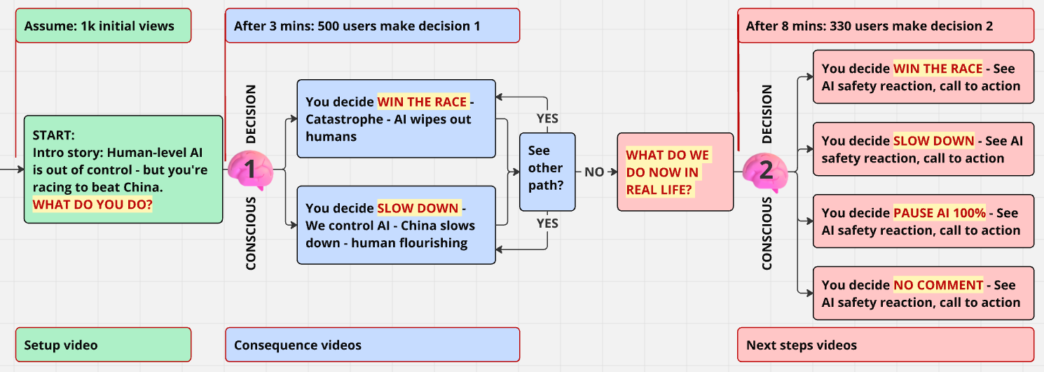 Beyond this, our hypothesis is that when viewers are required to make a conscious decision about AI safety, they will think harder about the subject and remember it better. Therefore we will run a test with 200 participants: half viewing the interactive version and half viewing an otherwise identical linear version. We will test their recollection of issues immediately after viewing and then again after 6 months. All results will be shared on the EA forum. Succeed or fail, these results should be useful to the wider AI safety YouTuber community.